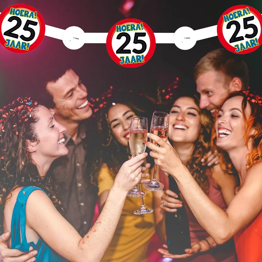 Ben je opzoek naar een manier om jouw feestje weer uniek te versieren? Dat gaat natuurlijk helemaal lukken met deze prachtige 25 JAAR! slinger! Hang deze prachtige slinger voor je raam of in je tuin en de hele straat weet dat er een geweldig feestje bij je aan de gang is. De kunsstof bordjes zijn 17 centimeter hoog en 45 centimeter breed, de lengte van de gehele slinger is (met alle bordjes) 7,5 meter. Omdat de slingerdelen verwisselbaar zijn kan je er ook twee kleinere slingers van maken óf combineer met een andere slinger uit ons assortiment voor een geinig en afwisselend beeld. Één ding blijft zeker, uw feestje zal prachtig versierd zijn!